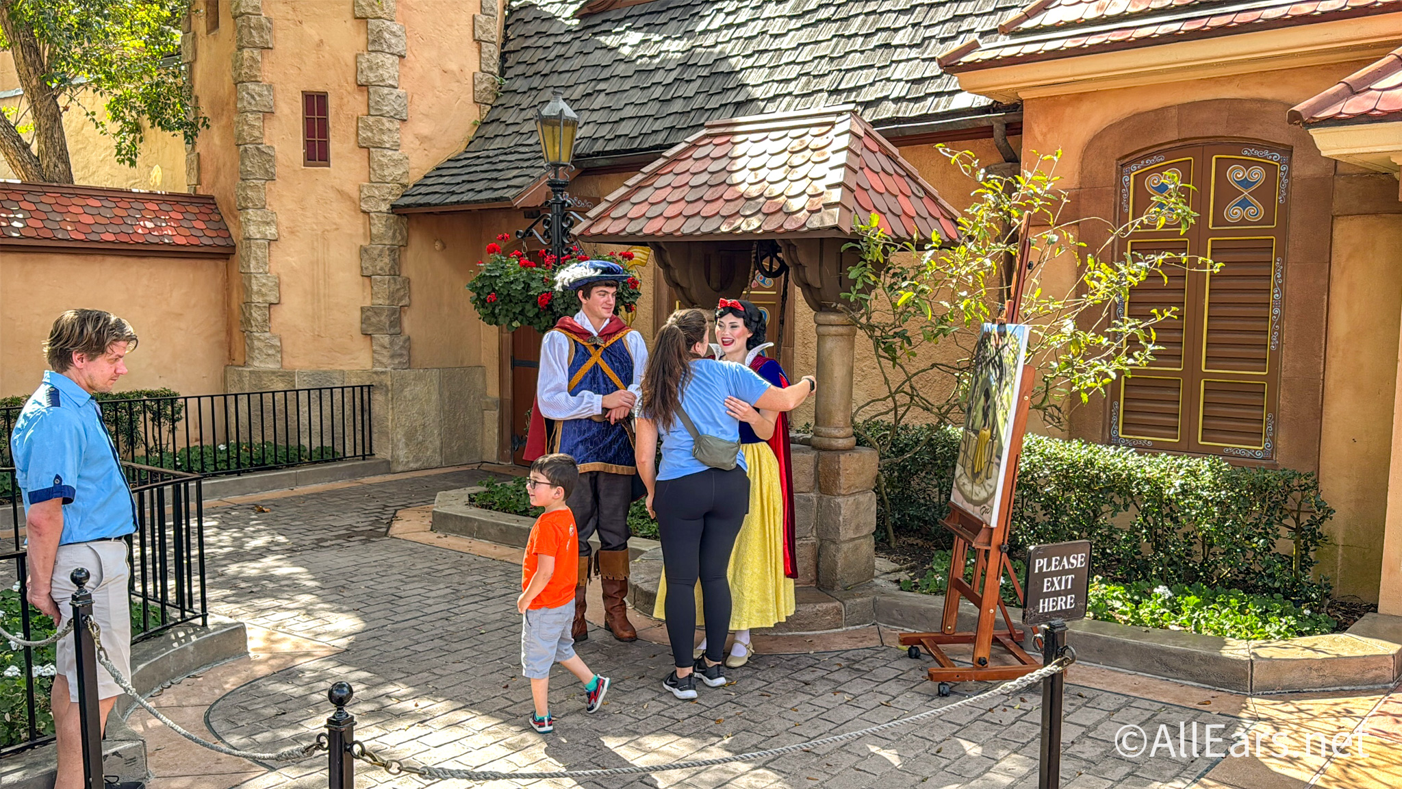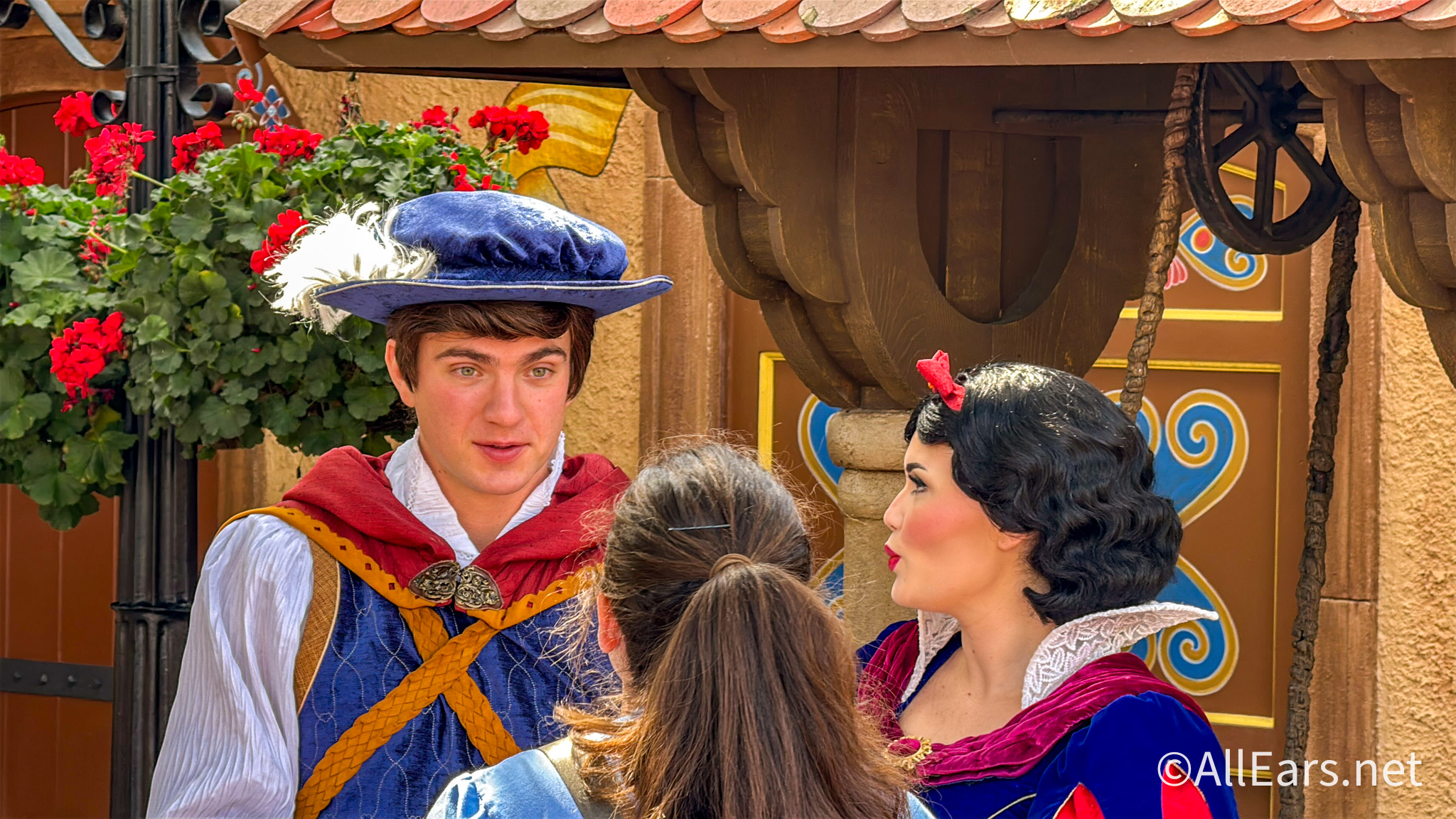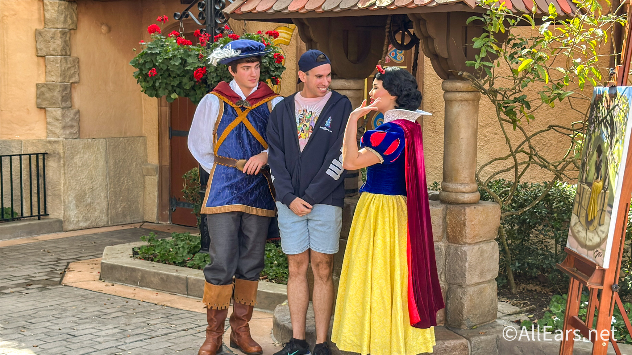 The couple was in front of the very wishing well that Snow White wished for her prince with. There was also a nice canvas of the iconic scene posted up in that spot.