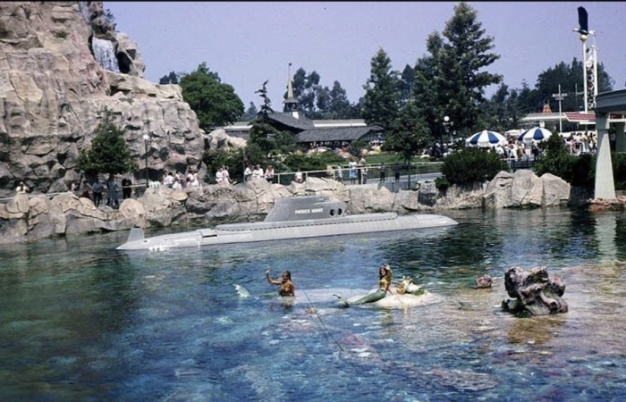 During the mid-1960s, Disneyland’s Submarine Voyage lagoon featured live mermaids — AKA Cast Members decked out in clamshells (wonder if that was leftover inventory from the Wizard of Bras?) and mermaid tails — sitting on rocks in the water.