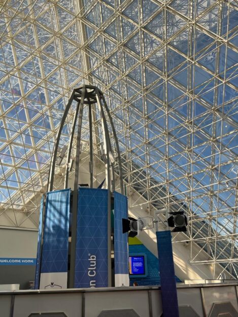 You check in on the first floor near the attraction’s gift shop and take either an elevator or a winding staircase to the second floor, where a massive glass dome encases the area and guests can enjoy great views of EPCOT.