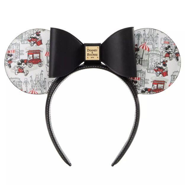 You can also get the same design but on a set of ears. We always love the leather detailing on the headband, bow, and ears. The main design is in black and white, like a hand-drawn sketch, but also has red accents to help bring it to life. I like how there’s a popcorn cart on it!