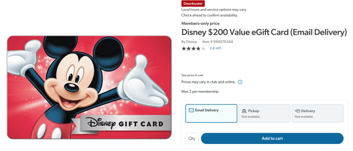 Right now, Sam’s Club members can save $10 off this $200 digital Disney gift card! This members-only offering is limited to a maximum of 4 per order and a maximum of 4 per membership.