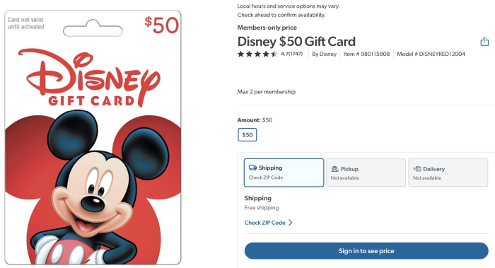 Sam’s Club often sells Disney gift cards for below face value! You can get this physical $50 gift card for $48.98! This deal is limited to a maximum of 2 per order, and a maximum of 2 per Sam’s Club membership.