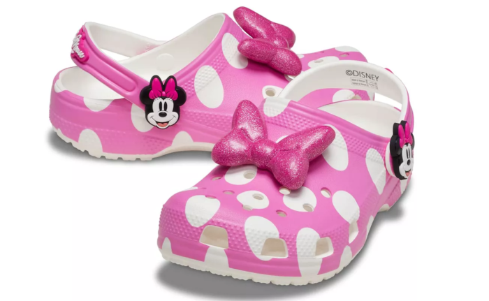 The Crocs Toddler Minnie Mouse Classic Clogs are designed with Minnie Mouse’s iconic style in mind! They have polka dots around the base and are topped with a big, red, glitter bow on each shoe! Minnie Mouse’s face adorns each of the rivets with her signature across the back strap.
