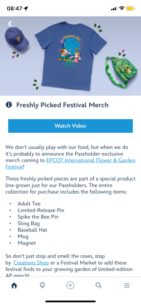 That was everything from the regular preview, but Disney also shared a peek at the Annual Passholder-exclusive merch in the Passholder Buzz section of the My Disney Experience app. Looks like this year’s line will feature Mickey and Minnie on a hat, t-shirt, and sling bag.