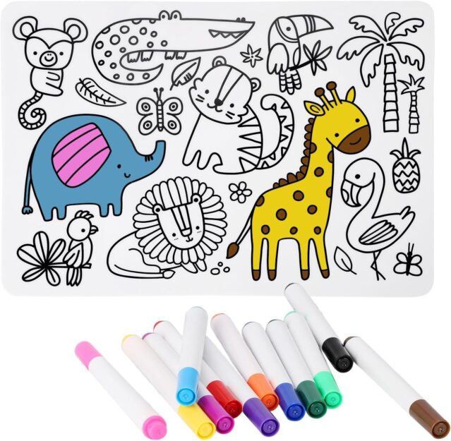 This Silicone Coloring Placemat is a washable painting mat filled with adorable patterns of wild animals like elephants, giraffes, and lions that comes with 12 colored markers. It’s much more lightweight than a coloring book and can be used as many times as you want!