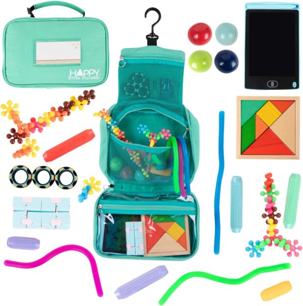 This Travel Essentials for Kids set includes magnetic building toys, an LCD writing tablet to doodle and draw, a tangram wooden puzzle, snowflake building toys, and various fidget and sensory toys for kids. Each kit includes a colorful hanging bag with 3 compartments — perfect for storing everything on the go!