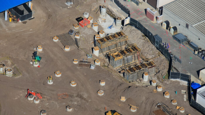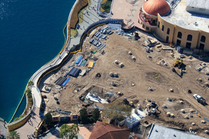 We can also see a straight line of footers closer to Despicable Me: Minion Mayhem. This very likely indicates a launch for the ride, especially since it’s close to those concrete forms. Now, this may not be the initial launch of the ride — it could be an additional launch inside the attraction.