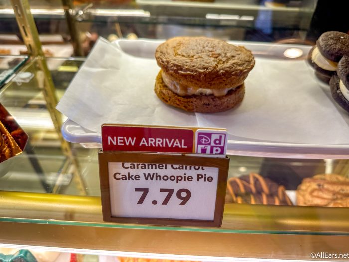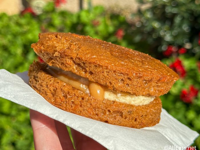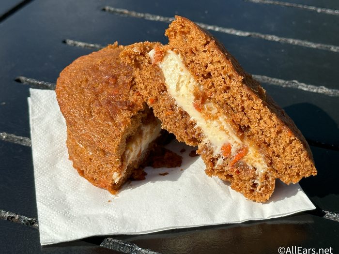 You’ll find a similar version of this snack, the Carrot Cake Cookie, at Trolley Car Cafe in Disney’s Hollywood Studios year round. That version has two pieces of carrot cake with cream cheese frosting in the middle.