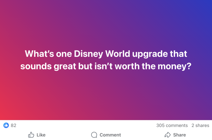 We reached out to our followers on Facebook and Instagram to ask: “What’s one Disney World upgrade that sounds great but isn’t worth the money?” We had quite a few people leave their opinions in the comments!