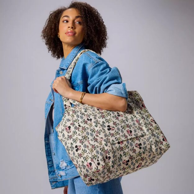 Don’t forget this Mickey and Minnie Mouse Floral Crescent Bag!