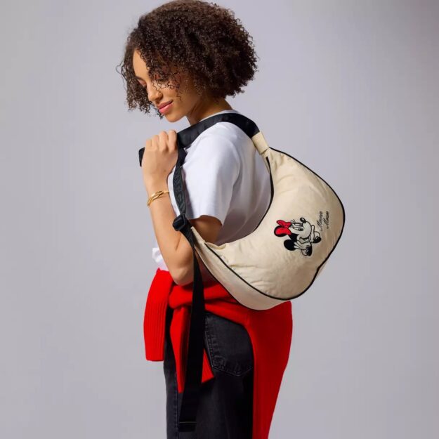 This Minnie Mouse Crescent Bag features a Minnie Mouse appliqué with an embroidered ”Minnie Mouse” signature. It’s adjustable and can be worn over your shoulder or as a crossbody!