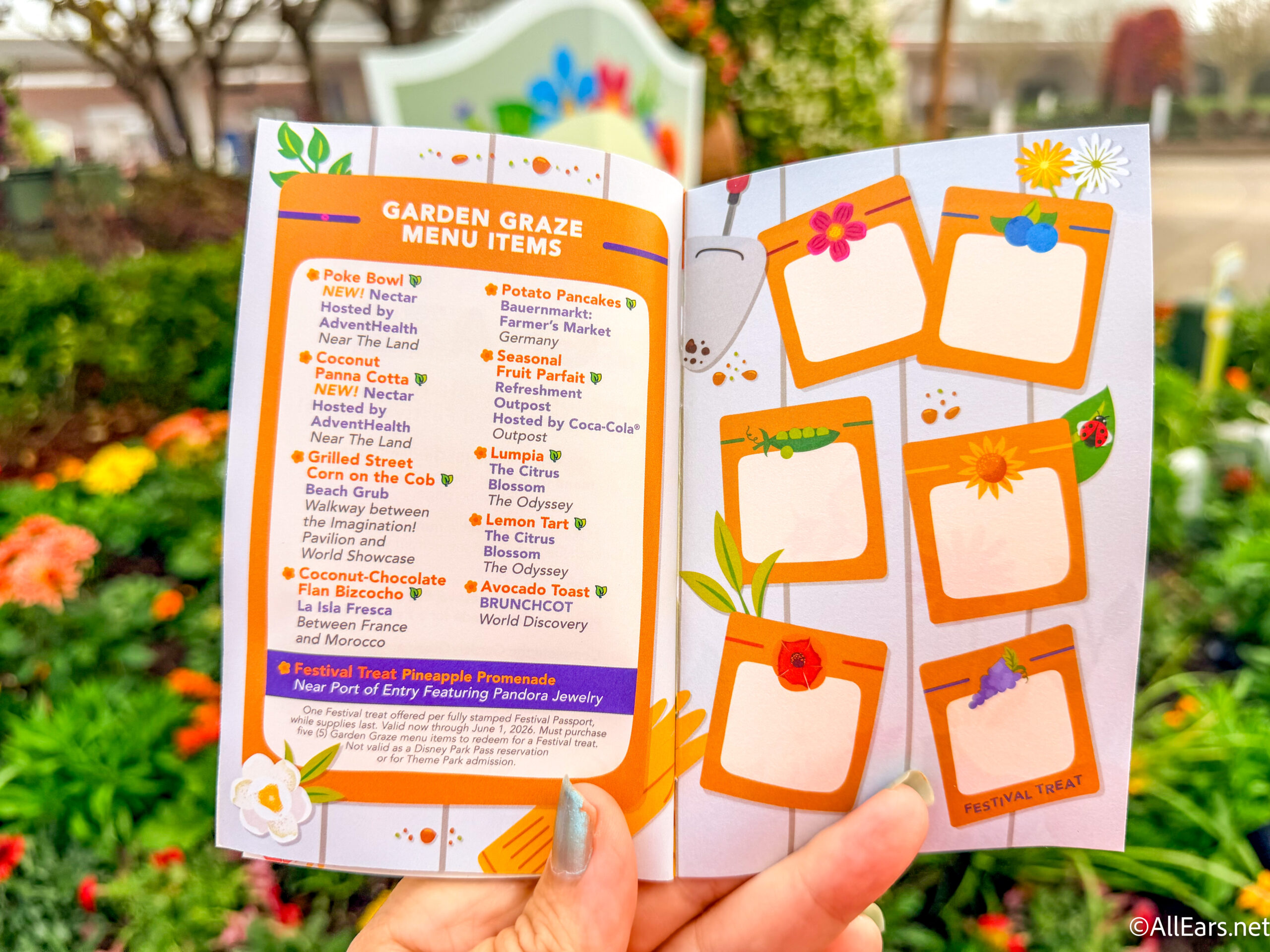 The Garden Graze is a food scavenger hunt of sorts. There is a list of nine different festival menu items you can order for the Garden Graze, and when you purchase one, the Cast Member at the outdoor kitchen will stamp your festival passport. Once you collect five stamps, you can redeem a PRIZE at Pineapple Promenade. Sounds fun, right?!