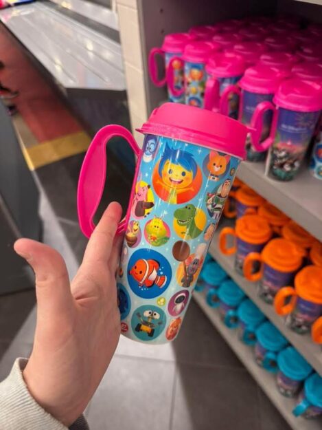 The latest mug design — from artist Jerrod Maruyama, who has made a name for himself within the Disney community because of his unique take on Disney aesthetics — features a litany of Pixar characters, including Joy, Sadness, Wall-E, Eve, Rex, Nemo, Woody, and Lightning McQueen, among others. They began appearing several weeks ago, and we’re finding them at various hotels across property now.