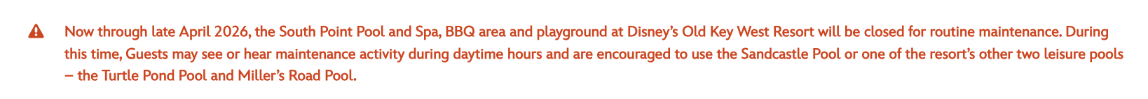 The South Point Pool and Spa, BBQ area, and playground will be closed from now through late April 2026 at Disney’s Old Key West Resort.