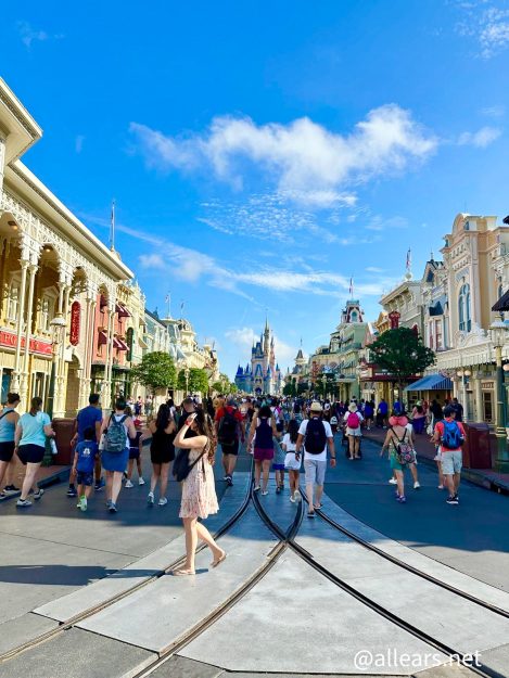On Main Street, U.S.A., you’ll usually have better luck near the Emporium side. The hub in front of Cinderella Castle? Basically zero shade. You’ll definitely want to proceed with caution.
