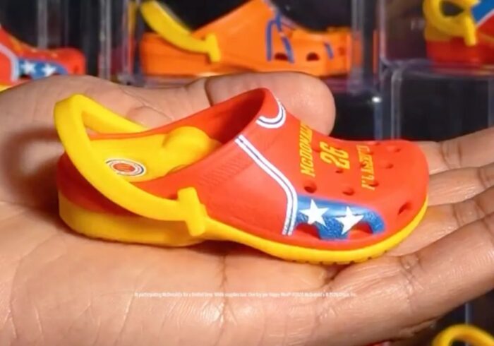 These new Happy Meals will feature a mini Crocs keychain for the toy. The first keychain that caught our eye was this McDonald’s basketball jersey Croc. Look at how small these are!