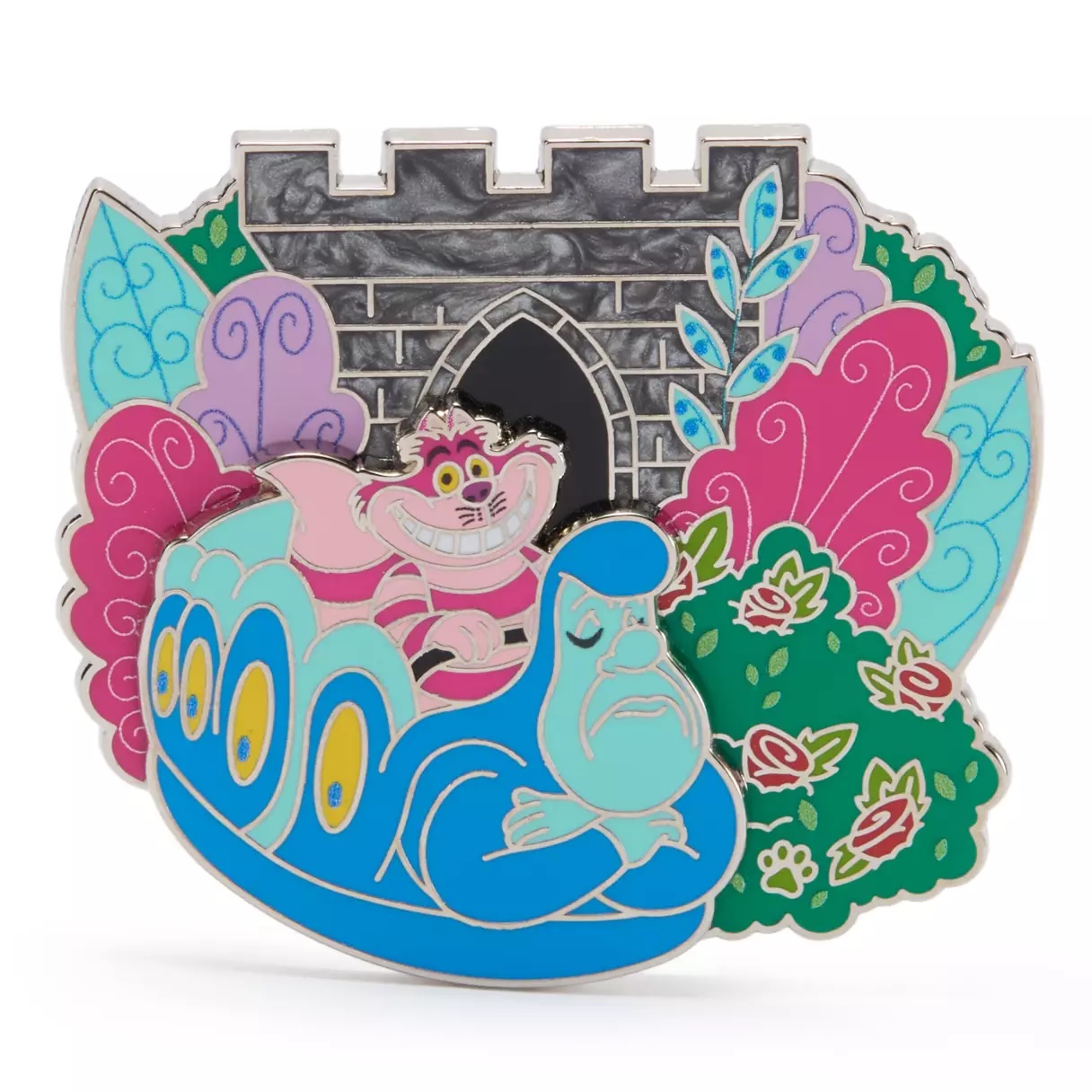 This dimensional pin-on-pin design drops into Fantasyland with two surreal visitors aboard, the Cheshire Cat and Caterpillar. Part of the ”Disney Duos” Disney Artist Collection by Maria Stuckey and Kate Dykstra – and inspired by the Alice in Wonderland attraction at Disneyland – it’s a cool yet curious addition to your pin collection.