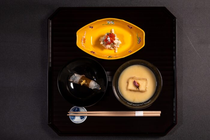 - Sea Bream: Kombu–cured Sakura style accented with edible gold leaf