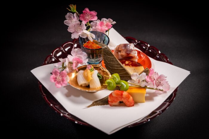 - House-Made Sakura Mochi with Sakura crystal jelly-salt-pickled cherry blossom