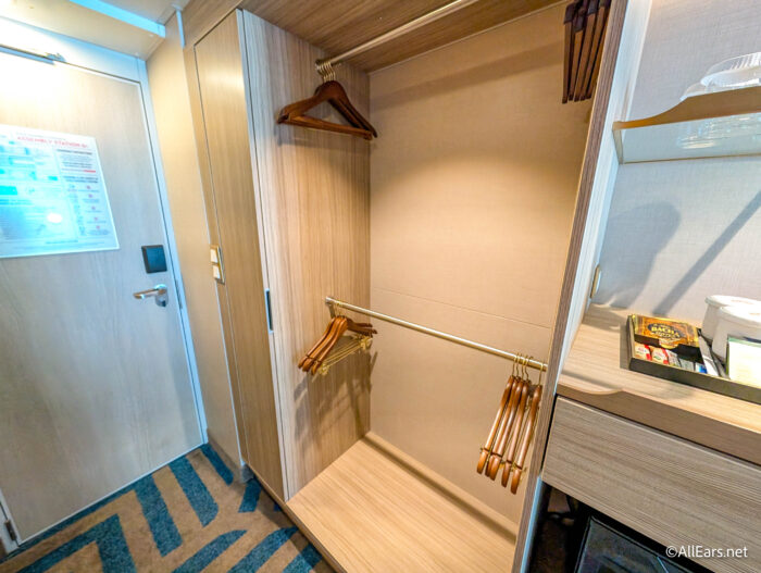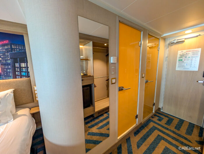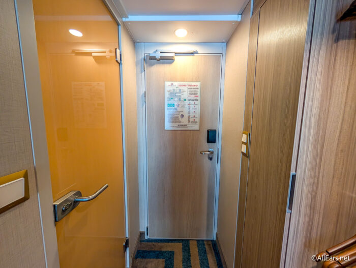 Walking into the stateroom, there’s a narrow entryway that leads to the bathrooms and the closet.