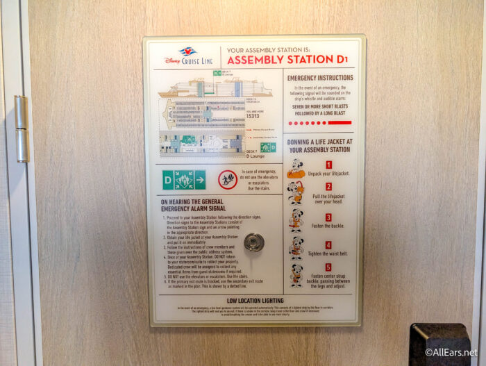 The back of your stateroom door will contain safety information and notes on your assembly station in case of emergency.