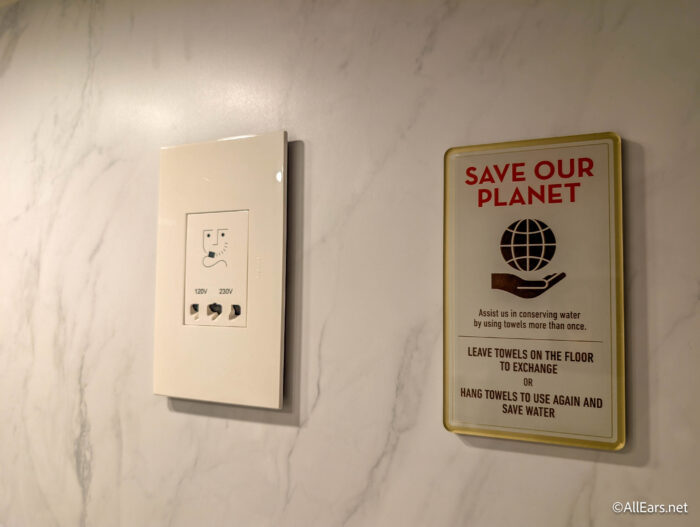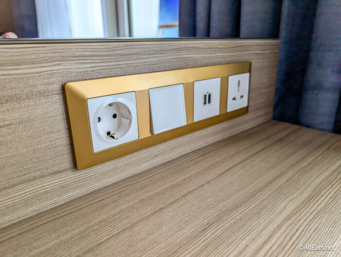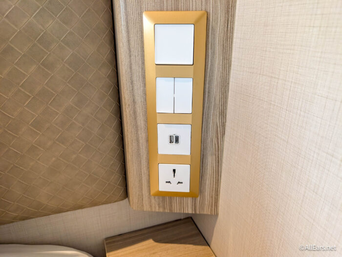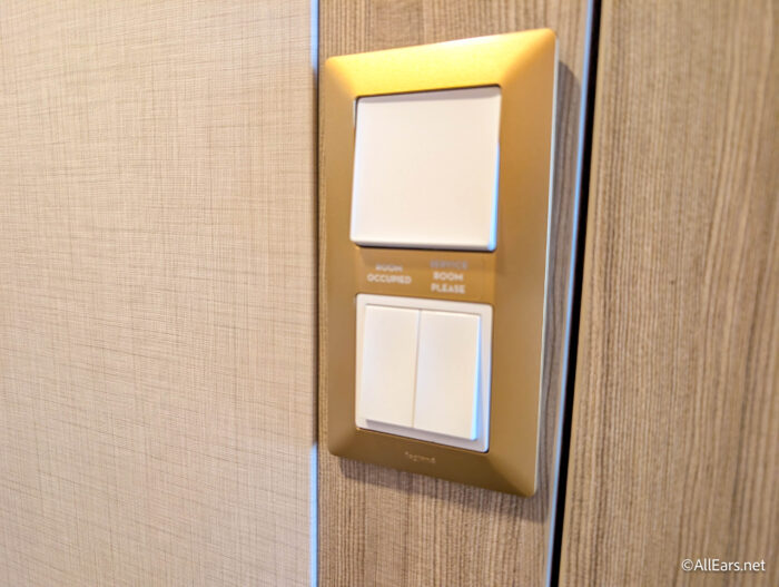 The lightswitch for the main lights of the room is right as you enter, this will also include controls for the service light outside your stateroom door. If you select “room occupied,” the light on your room number will glow red. If you select “service room please,” the light will glow green, and your room attendant will know that they can come by and service the room. Emma and I loved this feature!