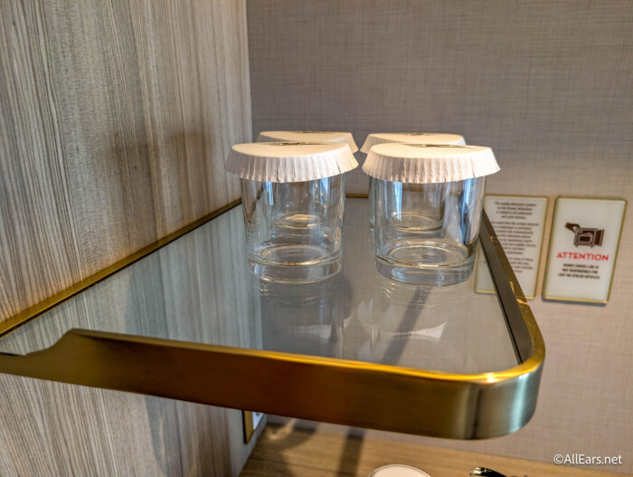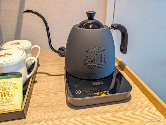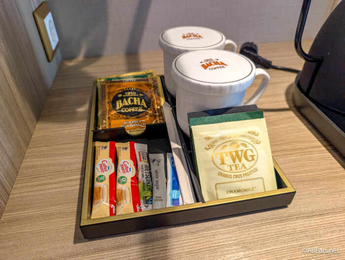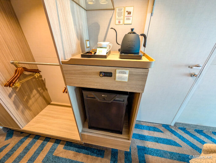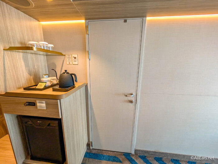 The mini bar in these rooms is a bit different than other Disney cruise ships, with a heavier focus on tea, since it’s a more popular beverage in Asia.