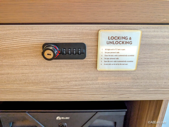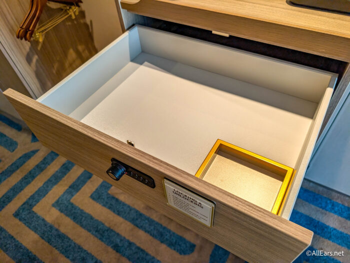 Instead of a regular black safe, the stateroom comes equipped with a locking drawer. Instructions for programming are included.