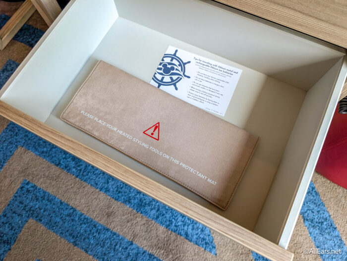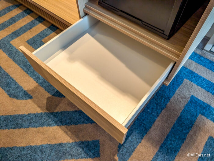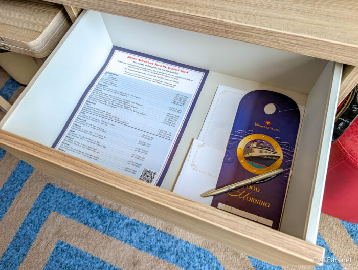 There is ample drawer storage over here, and inside, you’ll find basic ship information, stationery, and the room service menu for breakfast.