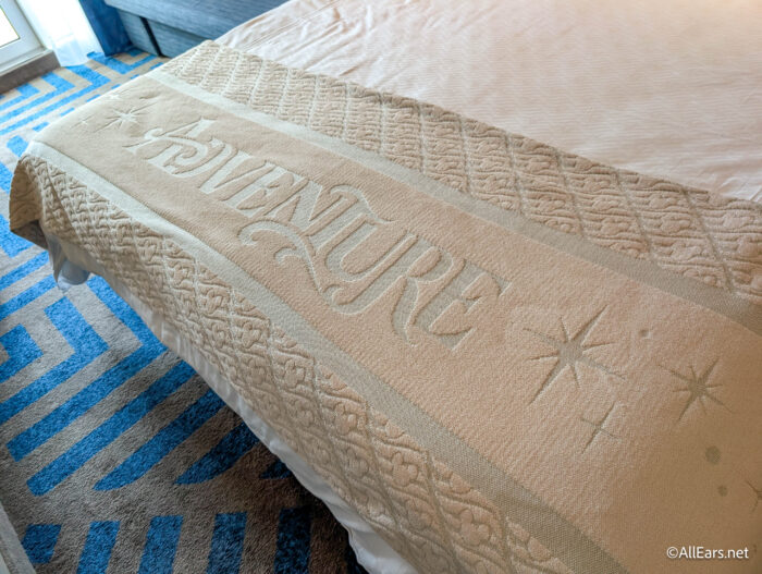 The bed was decorated with a Disney Adventure footer. I love the gold design with the ship logo!