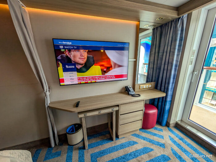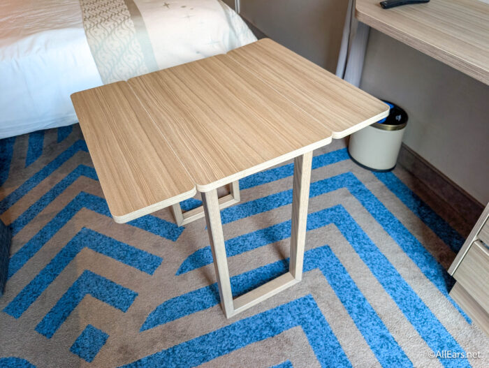One thing we like about this stateroom that’s different from other ships is this fold-out table. It’s stored underneath the desk, but it folds out to a decent size and can be moved around the room. That provides a little more flexibility with your room layout.