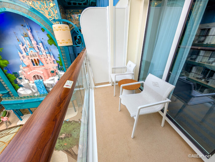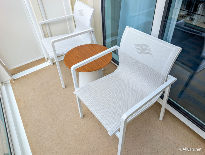 On the balcony, we had two Disney Cruise Line-themed chairs, as well as a small table.