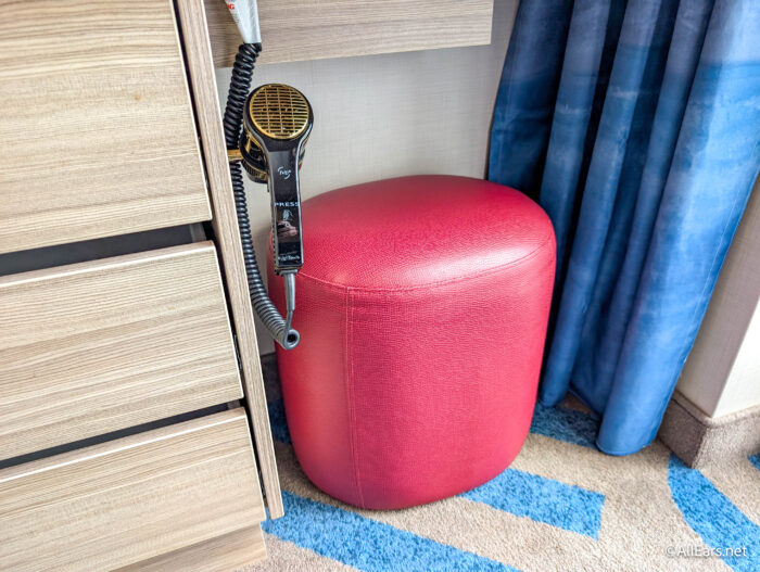 Underneath the vanity, there’s a small sitting stool and the hair dryer storage.