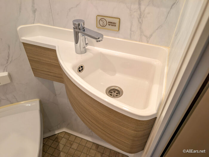 Now, on to the bathroom! These staterooms have a split bath layout. One room is home to a sink and shower combo.