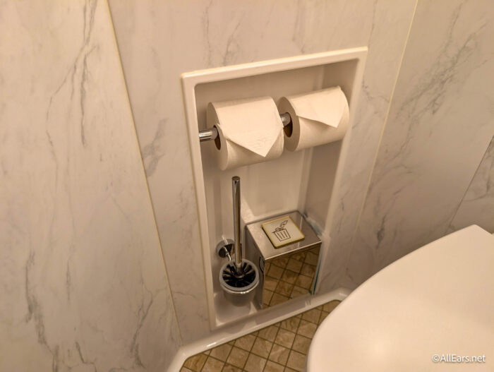 …and a storage area with toilet paper, toilet brush, and a small trash can.