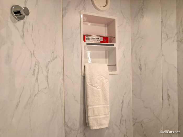 There’s a towel hook, a hand towel, and a sharps disposal box in the storage on the wall.