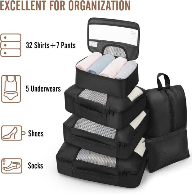 This set comes with 10 different bags, each in a different size. There’s a shoe bag, a folding cosmetic case, and even a mesh bag to see your dirty clothes in.