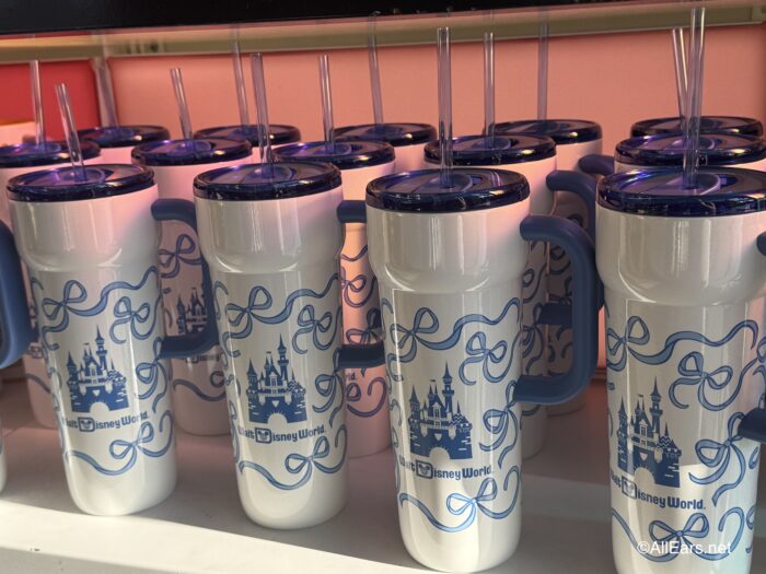 These tumblers come in cream and blue and feature the castle along with a ribbon design. They also include a lid and a straw.