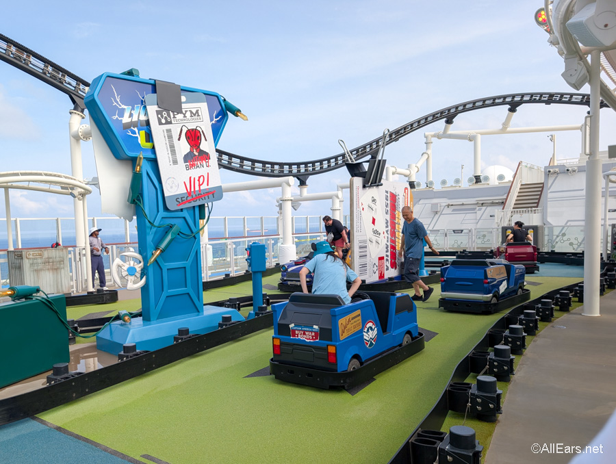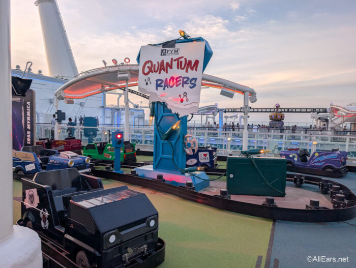 The ship’s Marvel Landing area is on its upper decks for guests “to experience hero-sized fun at our first adventure zone in the sea.” Marvel Landing will feature three new attractions, and we got the chance to ride Pym Quantum Racers. This ride puts you behind the wheel of a Pym Tech minicar for a “zip around a full-scale toy set track, navigating outsized and undersized obstacles along the way.”