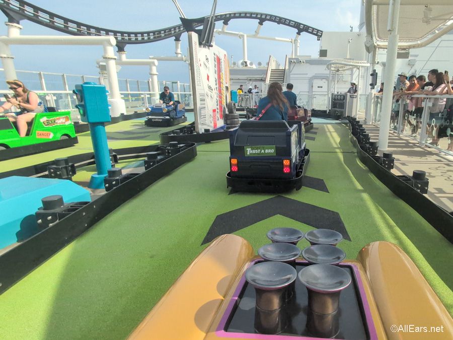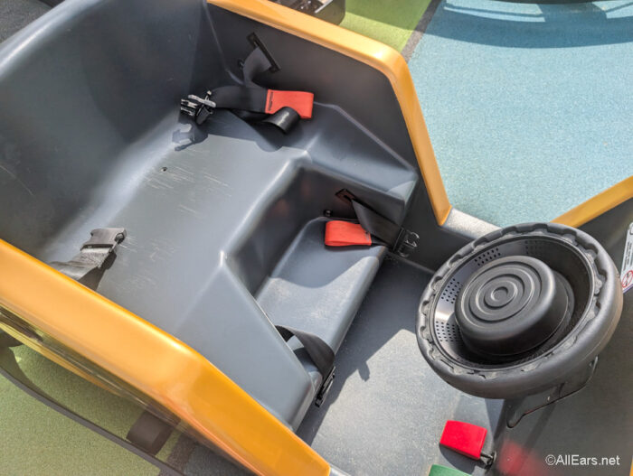 So, basically, you’ve got something a lot like Tomorrowland Speedway in Magic Kingdom or Autopia in Disneyland. This is a very slow-moving ride where you get about two laps around before the cars stop. We also noticed issues with the vehicles. They’re a little hard to steer, plus they sometimes stop. There are also occasional pile-ups, and the Cast Members have to push the cars around.