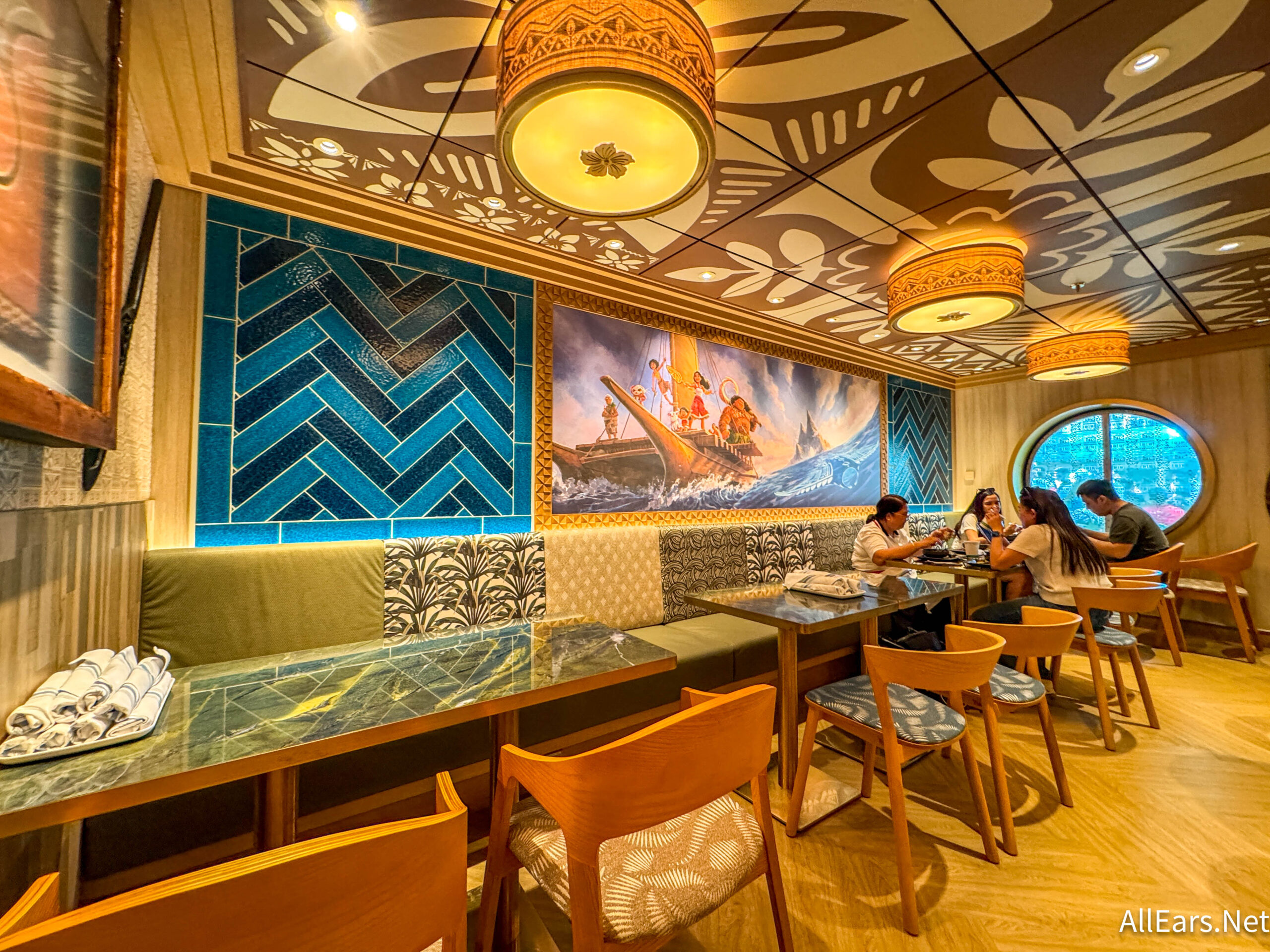 The restaurant is included in the cruise’s free dining! You will need a reservation to get in, though, which we booked in the Navigator app. The restaurant had some awesome Moana details like this mural!