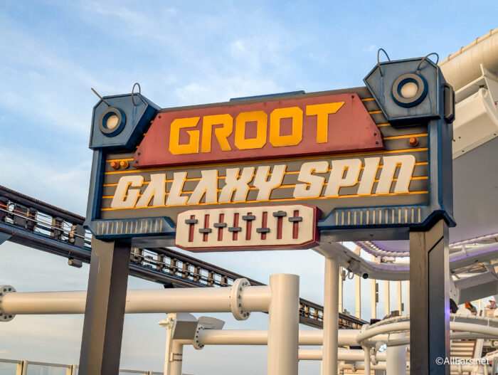 Groot Galaxy Spin blasts you into an “awesome mix of high-soaring feats and bass-boosted beats.” On the ride, Rocket and Groot have taken a bunch of parts from their ship, and they’ve combined those parts to make a spinning DJ platform.