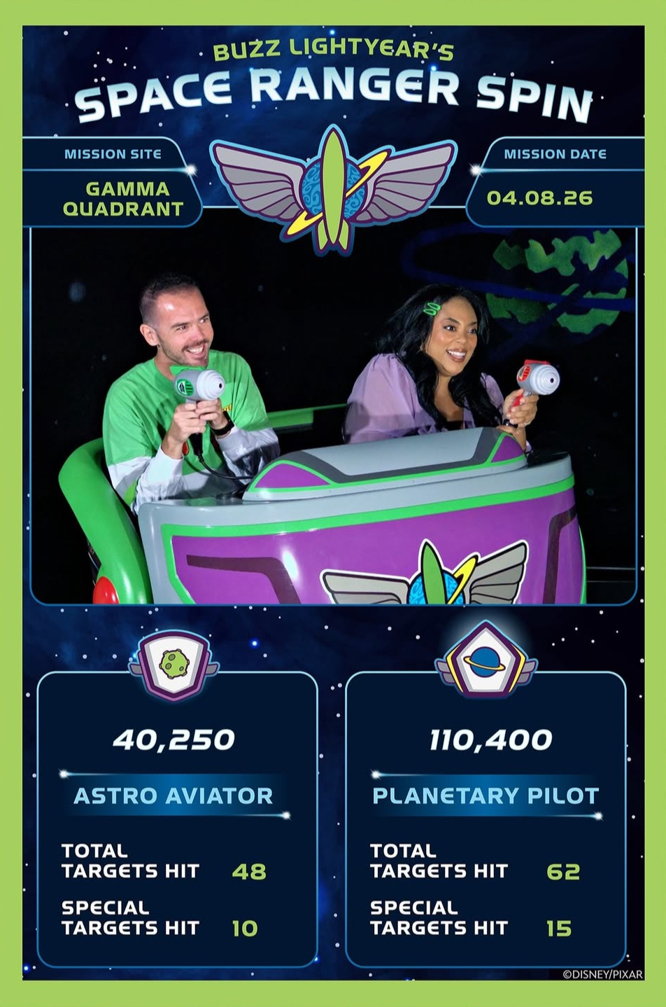 Here’s a look at the new PhotoPass ride photo coming to Buzz Lightyear’s ride! The new photo shows you and your player two, along with your ride scores, total targets hit, special targets hit, and your Star Command ranking! Now you’ll never forget your high score. Become a Galactic Hero? Now you have hard proof.