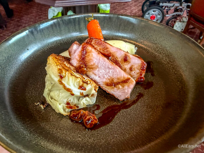 One of the two entrees available is the Chop Chop – It’s Bacon!, which is chargrilled bacon chop served with caramelized half cabbage, honey glazed carrots, and creamy mashed potatoes, then finished with a rich raisin cider and cider jus. A lot is going on here, but it’s all good things! The chargrilled bacon is delicious with that wonderful chargrilled flavor, and the rich raisin cider and cider jus just enhance the flavor isn’t more. The mashed potatoes are very soft and creamy, so much so that they basically melted in our mouths, and have a rich flavor that almost came across as buttery to us. The carrots are pretty soft and easy to bite, and that honey glaze really does make them sweet, which makes them pair well with the cabbage.