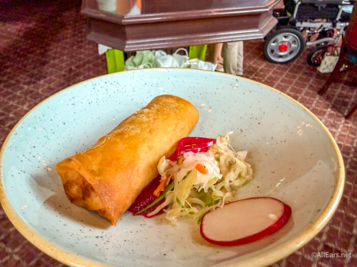 We started out with the Ireland in a Spring Roll starter, which is a golden pastry filled with smoked Irish bacon and tender cabbage served with a velvet red cabbage purée and a pickled vegetable salad. This is the PERFECT size for a starter, and the Irish taken on the inside is very flavorful. It’s soft on the inside with that crispy golden outside, and the purée on the bottom is a great addition, making the flavor a tad sweeter. Consider us big fans!