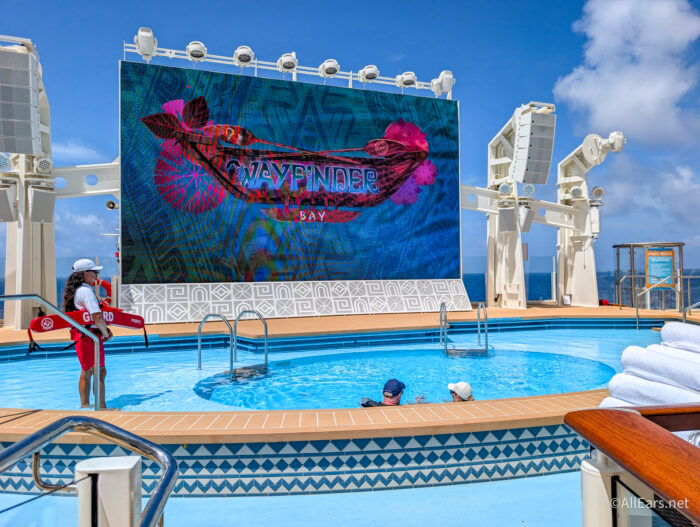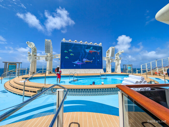 The giant screen near the pool allows for the area to double as an area for interactive events and live shows like Moana: Call of the Sea.
