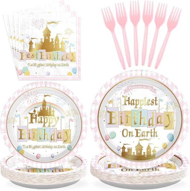 It comes with 24 9″ happy birthday on earth dinner plates, 24 7″ happy birthday dessert plates, 24 6.5 “Best birthday” napkins, and 24 pink forks for each set that can serve 24 guests.