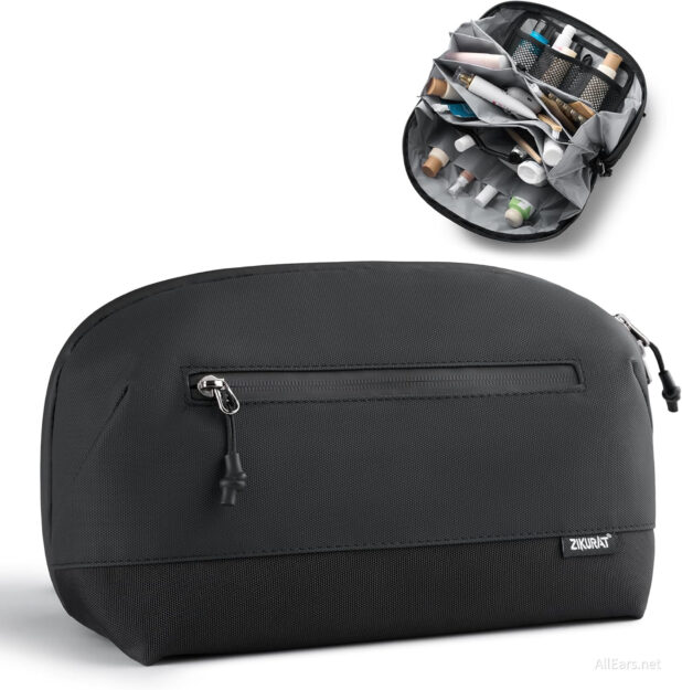 This toiletry bag includes a detachable magnetic pouch for small essentials like a toothbrush, razor, or skincare items, a separate waterproof outer compartment to store wet items like towels or toiletries, and water-resistant fabric and zippers to prevent spills and leaks.