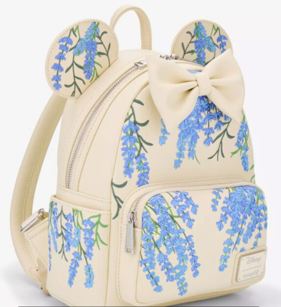 This 9″ W x 10 1/2″ H x 5″ D Loungefly, available at BoxLunch, features embroidered blue blossoms and a figural bow and ears.
