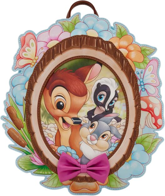This 9″”W x 10.5″”H x 4.5″”D – 22.8cm W x 26.6cm H x 11.4cm D bag features Bambi, Thumper, and Flower surrounded by foliage, plus faux-leather construction, a sturdy top handle, adjustable shoulder straps, a 3D bow, applique, debossed, embroidered, and printed details, and coordinating interior lining.